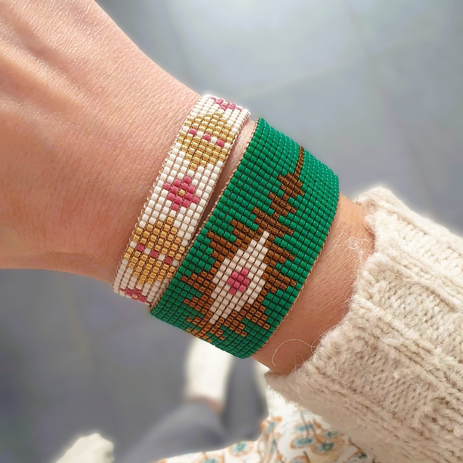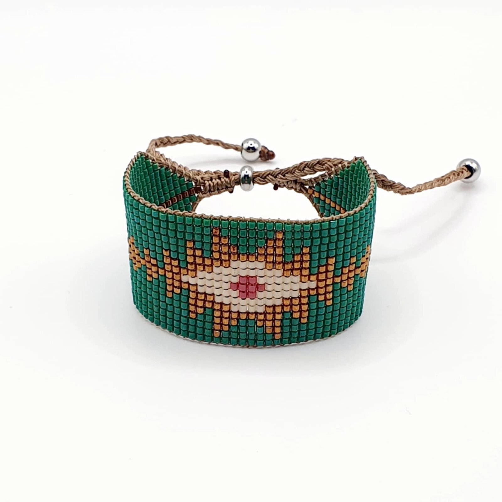 Les perles de verre Miyuki offrent un rendu lumineux et une grande régularité, essentielles à la finesse du tissage. Ajustable et confortable, ce bracelet reflète l’exigence des bijoux artisanaux haut de gamme.