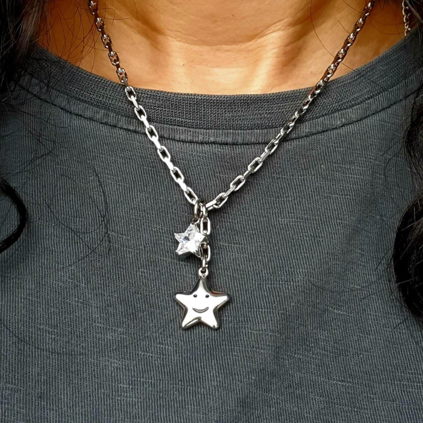 Les étoiles ont toujours fasciné les humains, symbolisant l’espoir, les rêves et l’orientation. Dans l’astrologie et la culture populaire, elles sont souvent considérées comme des guides dans les moments d’incertitude ou des rappels que les objectifs élevés sont toujours atteignables. Avec ce collier, chaque étoile représente une facette différente de cette symbolique. Le pendentif étoile classique incarne la sérénité et l’harmonie, tandis que le pendentif étoile souriante ajoute une dose de positivité et de joie. Ensemble, ces deux éléments créent une signification émotive qui résonne avec l’individualité de chaque personne qui choisit de porter ce bijou.