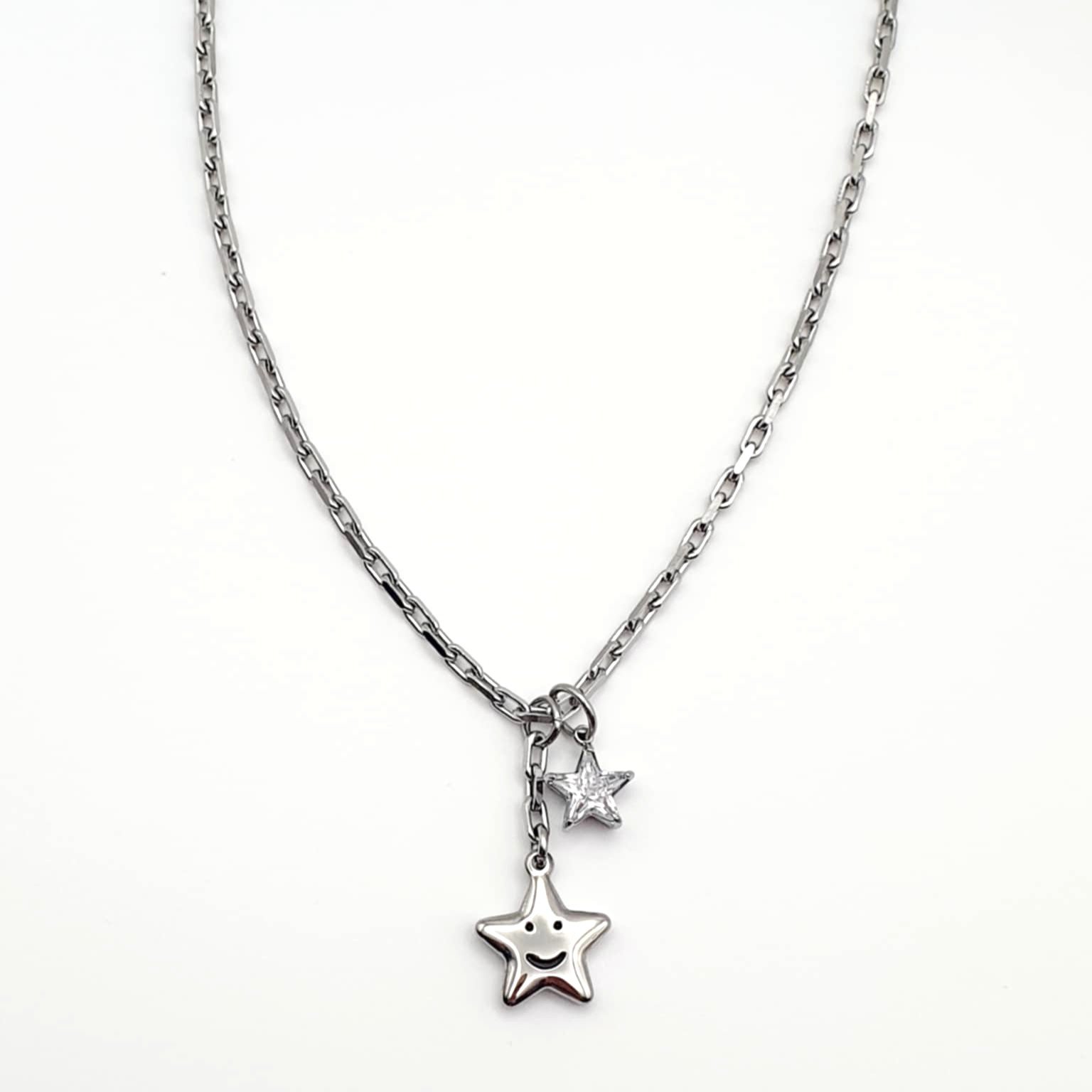 Collier en acier inoxydable, orné de deux pendentifs étoiles. Ce modèle combine à la perfection durabilité et finesse, faisant de lui un incontournable pour sublimer vos tenues au quotidien.